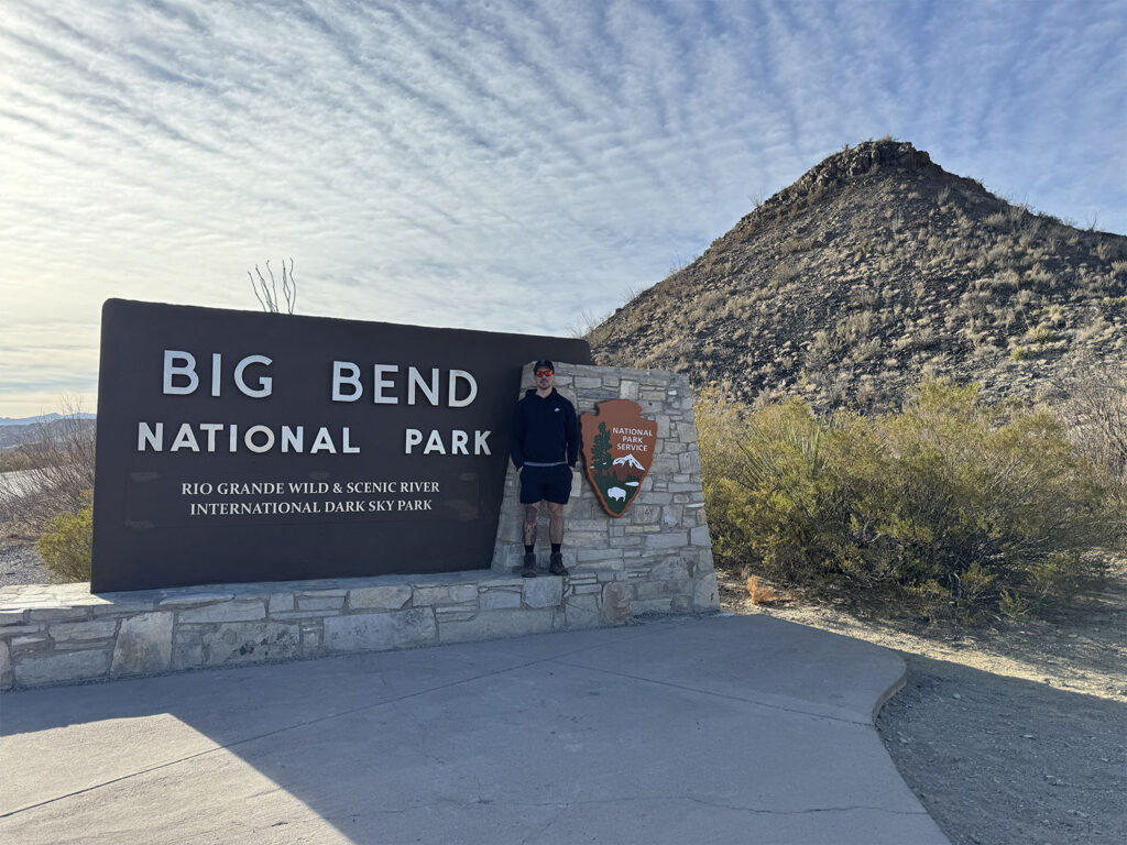 We woke at 7:45 AM and enjoyed a leisurely breakfast of fruit and yogurt on the front patio, basking in the warm morning sun. With a hot day in the forecast, I packed the cooler with fluffernutters and assorted snacks, filled both CamelBaks, and added four extra water bottles. By 8:50 AM, we were out the door. We had no firm agenda, other than to spend the morning exploring the Ross Maxwell Scenic Highway—one of the three main routes through Big Bend National Park—and, of course, to stop for the obligatory photo at the park entrance sign.