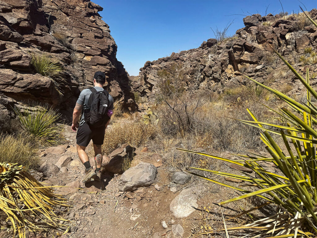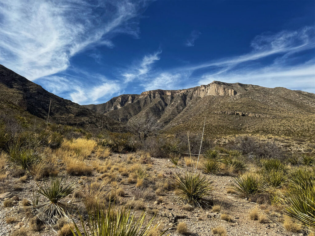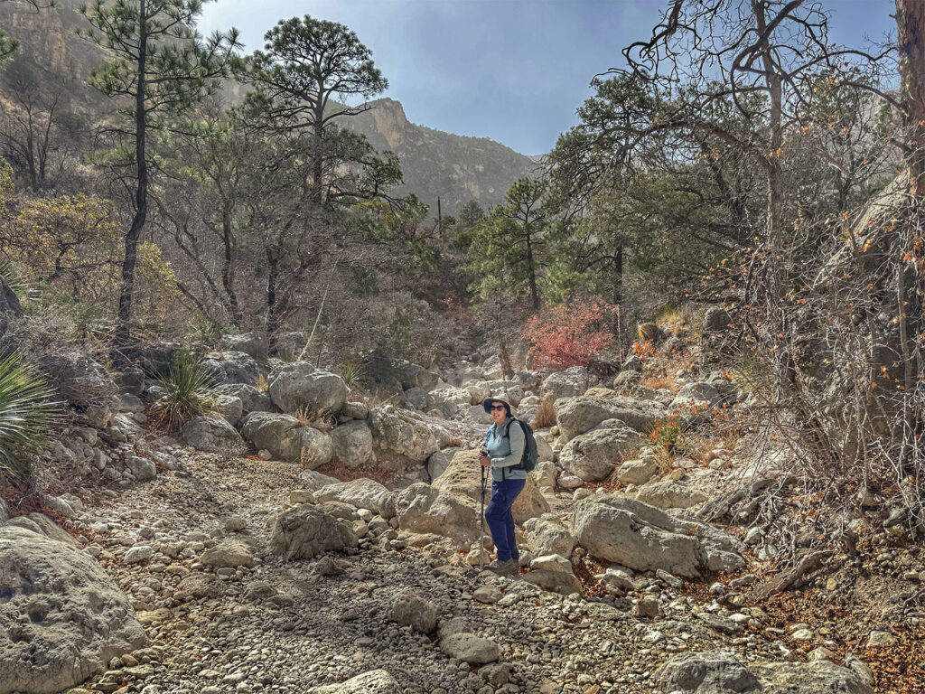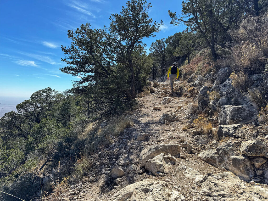 We drove 50 minutes south along Route 62, returning to Guadalupe Mountains National Park under ideal hiking conditions: clear skies, minimal wind, and temperatures in the upper 50s to low 60s. With the strong sun, it felt much warmer. We slathered on sunscreen, pulled on our hats, and, poles in hand, set out on the trail.