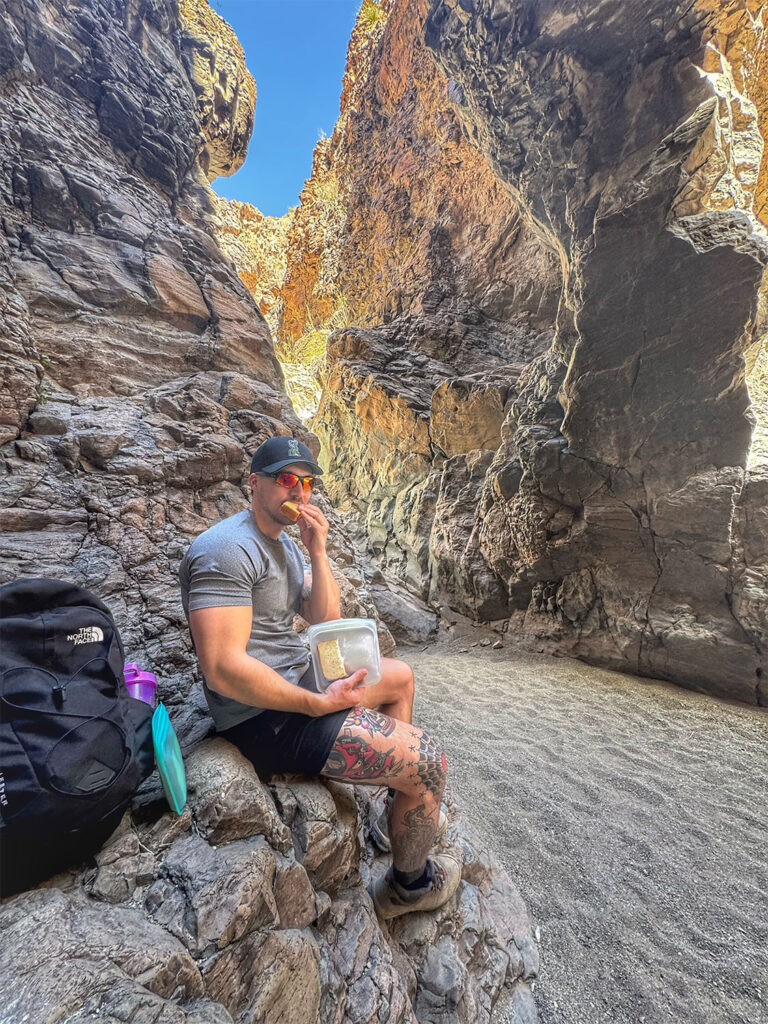 Around 12:30 PM, we pulled into the trailhead for the Upper Burro Mesa Pouroff Trail, a 3.5-mile round-trip hike with 492 feet of elevation gain—most of it, unfortunately, on the return. The trail follows sandy washes and rocky canyons, making the trek especially tiring in the midday heat. Just before the turnaround point, the trail descends two slickrock drops—one about 8 feet, the other closer to 20—leading into a grotto-like cavern. A narrow “V” in the rocks marks the final pour-off: a dramatic 100-foot drop that ends the trail. There is a separate, shorter route—the Lower Burro Mesa Pouroff Trail—that leads to the base of the pour-off, but the two trails do not connect. We took a break in the grotto, one of the only shaded spots along the route, and had lunch there. The hike back, under the full force of the sun and uphill through loose sand, wasn’t exactly fun—but we both agreed it was well worth the effort.