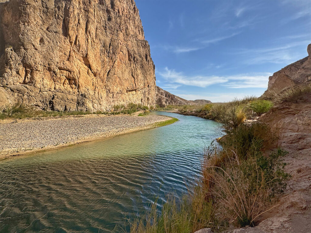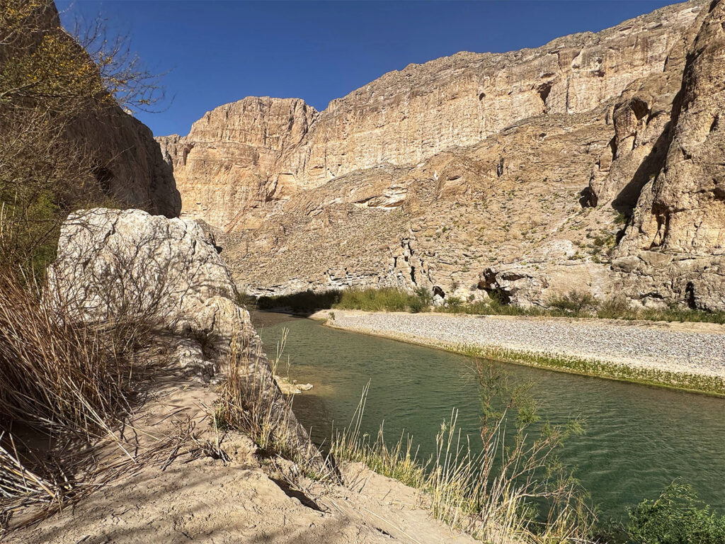 I had hiked this trail during a previous visit. It’s a relatively short and easy 2-mile round trip, though it begins with a series of steep steps and switchbacks. The trail starts by crossing Terlingua Creek, which in 2023 had been waist-deep, forcing us to make an improvised, off-trail crossing. This time, both the Rio Grande and Terlingua Creek were running extremely low, and a makeshift log bridge allowed for an easy crossing. On my last visit, the river had been dotted with kayaks and canoes; today, the water level was so low that paddling was clearly not an option, and the boats were nowhere to be seen. We were able to walk much farther into the canyon this time, right down onto the exposed riverbed, taking in the sheer, majestic cliffs in near silence.