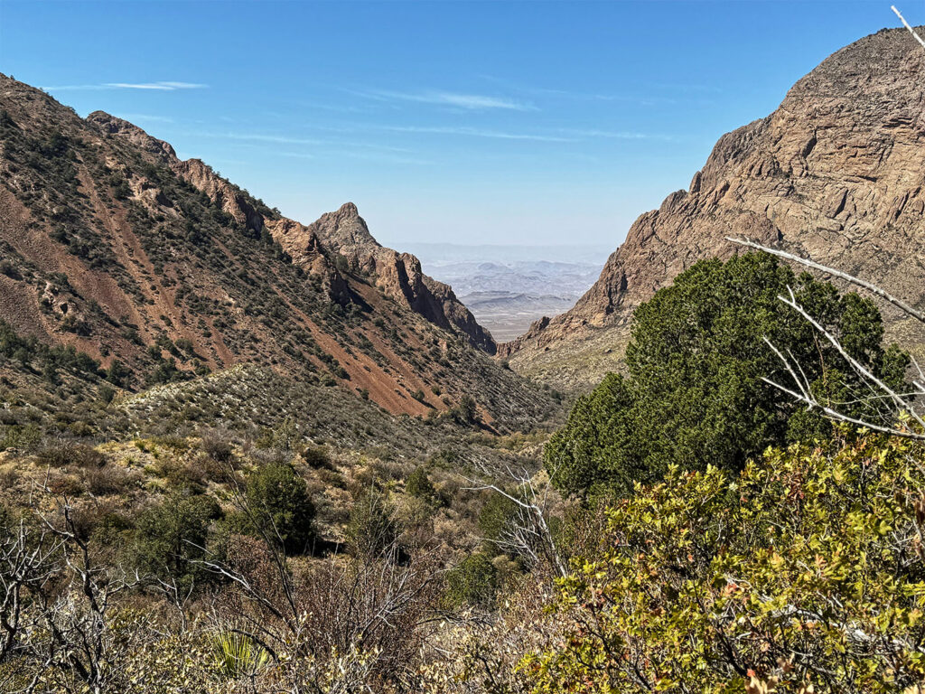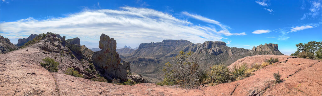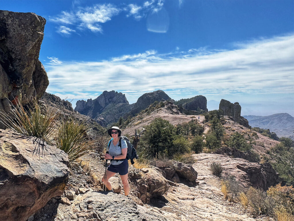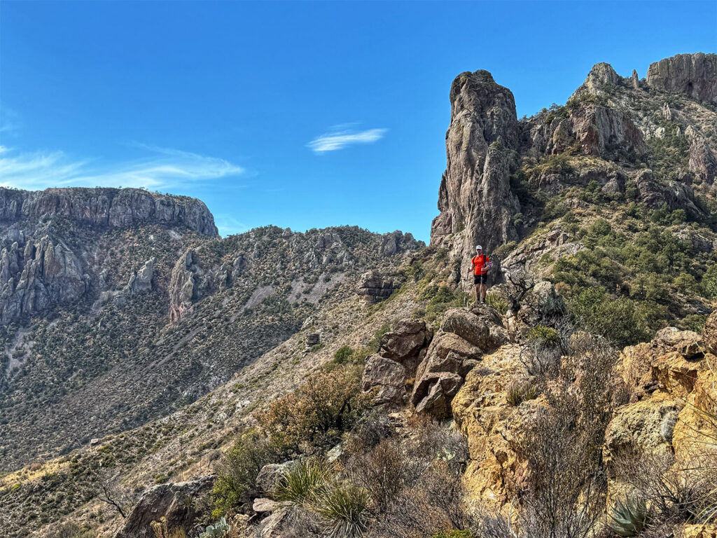 We hit the trail around 10 AM. The Lost Mine Trail is a 4.8-mile out-and-back route with numerous switchbacks, winding through juniper, oak, and pine woodlands. The views along the trail are breathtaking—Casa Grande and Juniper Canyon unfold to the east, while closer to the turnaround point, sweeping vistas of Pine Canyon and the Sierra del Carmen mountains in Mexico come into view. There are a number of exposed sections, especially near the top, but Ryan handled them admirably despite his fear of heights. He always seems more confident on the descent than the ascent.