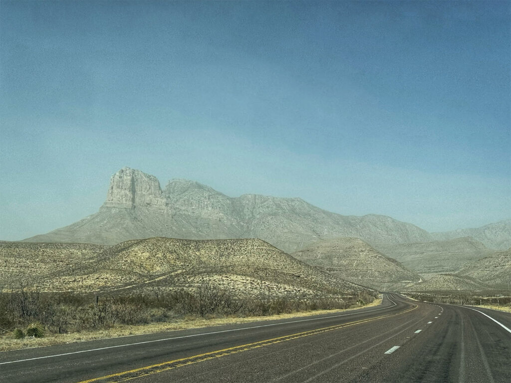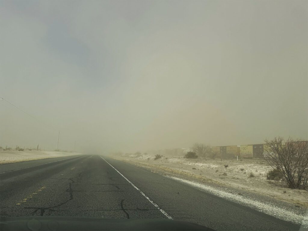 We checked out of our Airbnb around 9 AM and began the journey north. A high wind advisory had been issued, so we weren’t entirely sure what conditions to expect. Though the gusts had roared through the night, by morning they had momentarily quieted. Of course, the reprieve was short-lived. As we retraced our route back to Van Horn, Texas, we drove through multiple brownout conditions—sweeping waves of dust so thick it felt like navigating a snowstorm, only the snow was ochre-toned sand. The landscape took on an eerie, apocalyptic atmosphere.