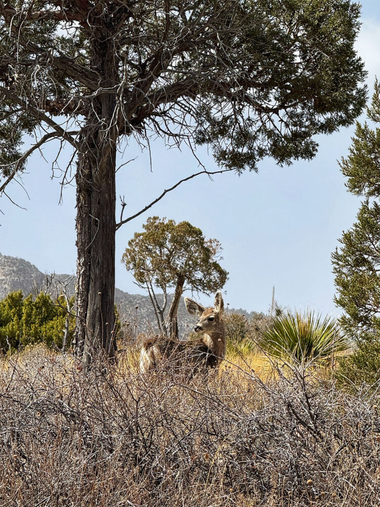 The wash section required scrambling over large boulders and loose rock, which made for a fun and engaging hike. Less than a quarter mile in, we encountered a charming family of mule deer, calmly picking their way through the underbrush. As we progressed, the trail revealed stunning geological formations, sheer canyon walls, towering trees, and expansive views of the surrounding peaks. Ryan kept scanning the skyline, trying to trace the path that would eventually lead us to Guadalupe Peak the following day.