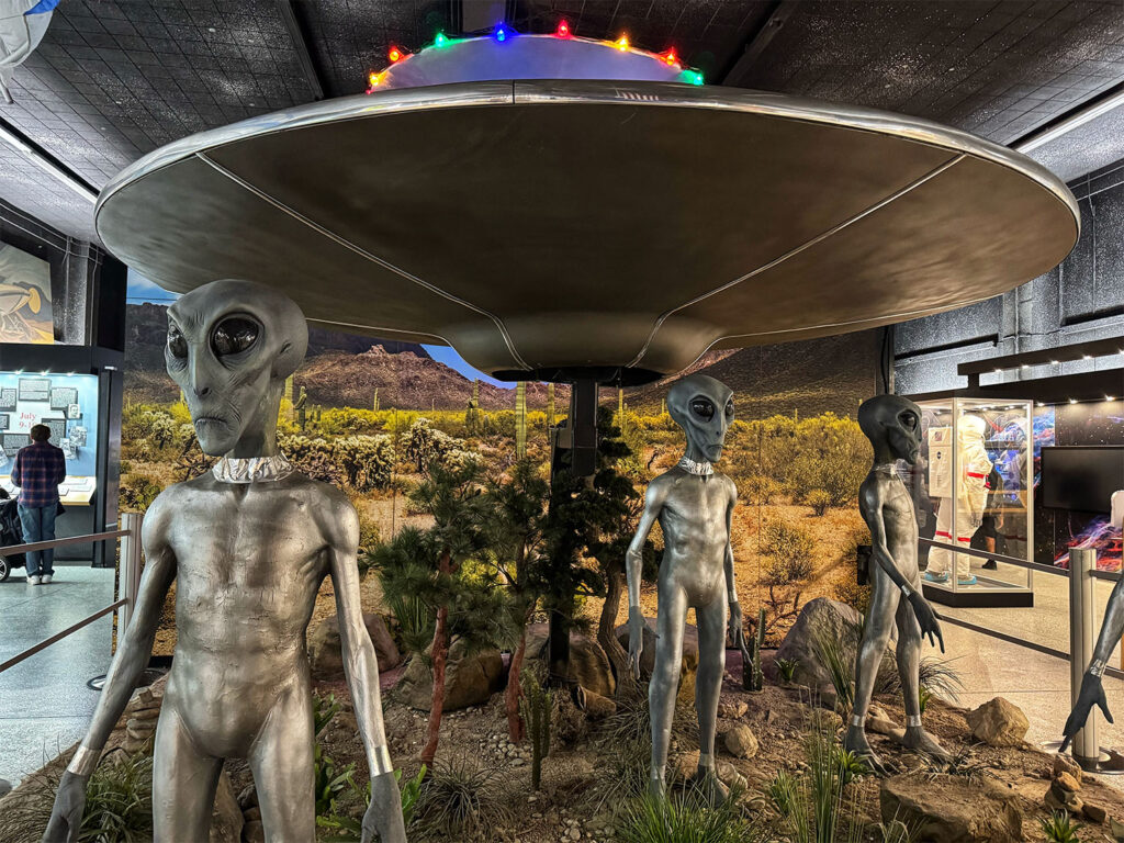 As we drove back toward the town of Carlsbad, the wind had picked up considerably, reducing visibility and casting a strange haze over the landscape—it was hard to tell whether it was dust or just atmospheric haze. We made a quick stop at McDonald’s, then headed north toward Roswell, New Mexico. Given the worsening weather, we decided to make a detour and visit the International UFO Museum and Research Center.