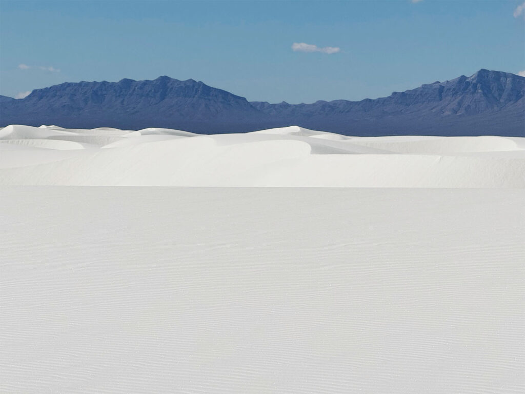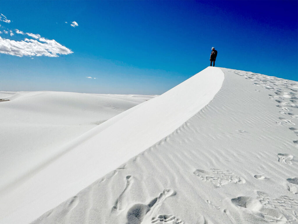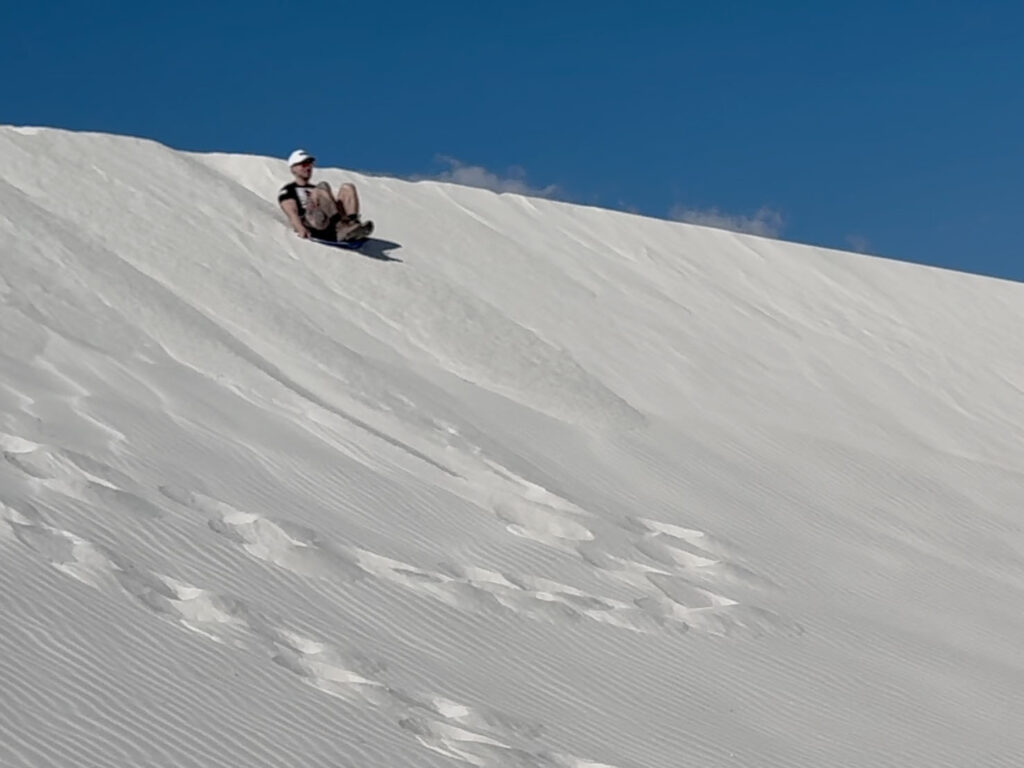 As we packed the car, the unmistakable roar of fighter jets cut through the air. Holloman Air Force Base is just a few miles away, and sure enough, we caught sight of another jet taking off as we passed the base. At the national park visitor center, we picked up a trail map and a small block of wax to help our sled slide better on the dunes. Though the park isn’t large and has only a few trails, it makes up for it in sheer visual impact.