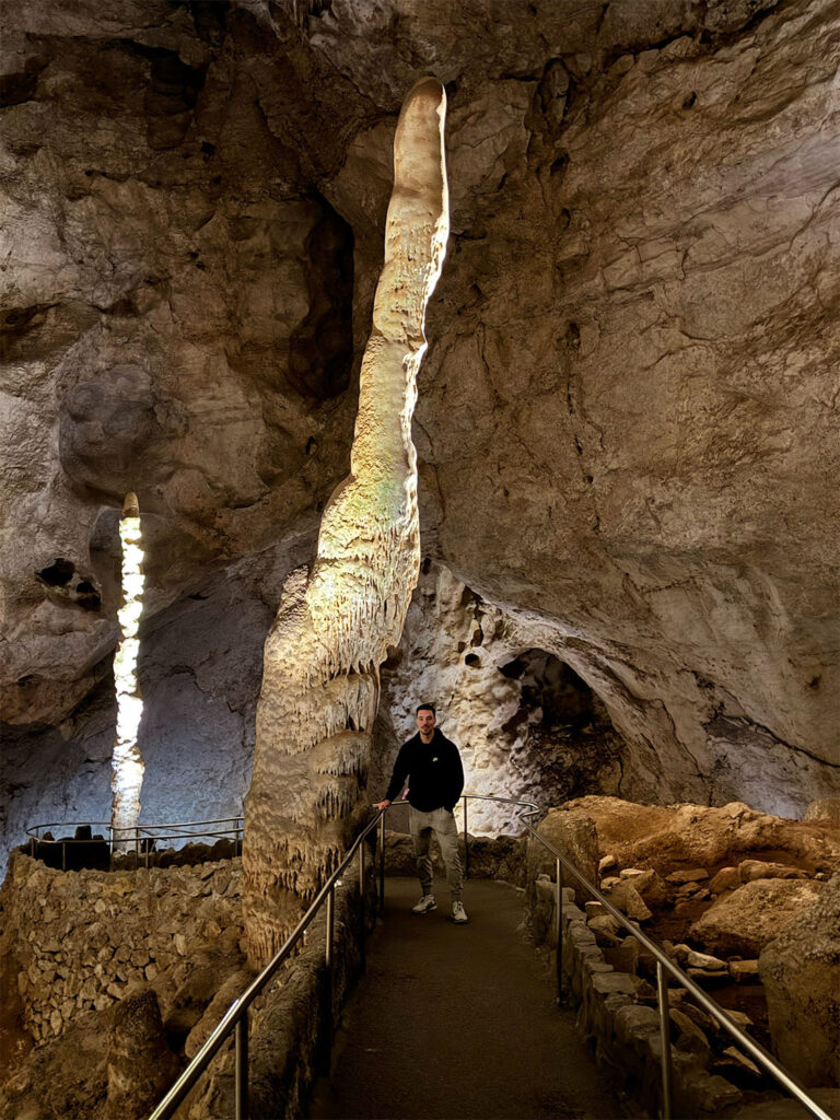 After about an hour, the natural entrance trail merged with the elevator trail inside the Big Room. Covering 8.2 acres—roughly the size of six football fields—it’s the largest publicly accessible cave chamber in North America. Measuring approximately 4,000 feet long, 625 feet wide, and 255 feet tall at its highest point, the space is vast and awe-inspiring. The Big Room Trail is a 1.25-mile loop, with a shortcut for those who want a shorter walk. We chose to take the full loop, walking counterclockwise.