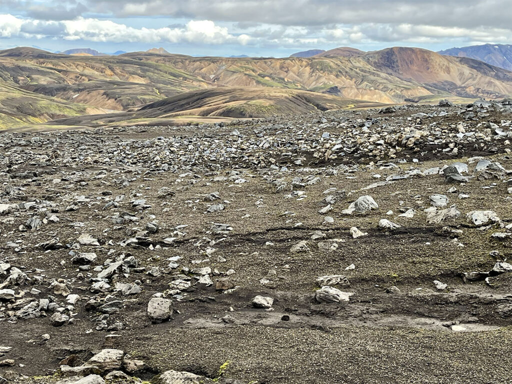 At noon, we officially set out on the trail under gray skies and a steady drizzle. Clad in full rain gear with covers on our packs, we began the 7.5-mile (12 km) ascent to the Hrafntinnusker Hut, the highest point along the trek at 3,743 feet. The trail’s opening stretch climbs through the Laugahraun lava field, alive with geothermal activity—steam vents hissing, and pools bubbling from beneath the earth. Beyond the lava field, we entered a realm of vividly colored rhyolite mountains, their hues muted slightly by the weather.