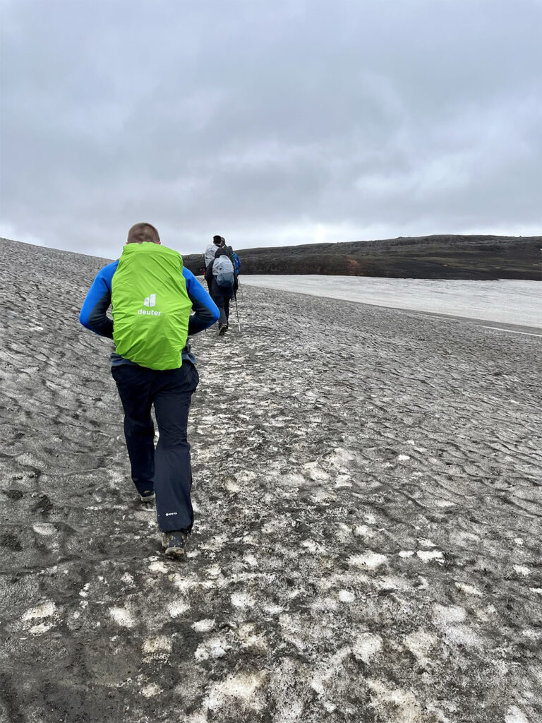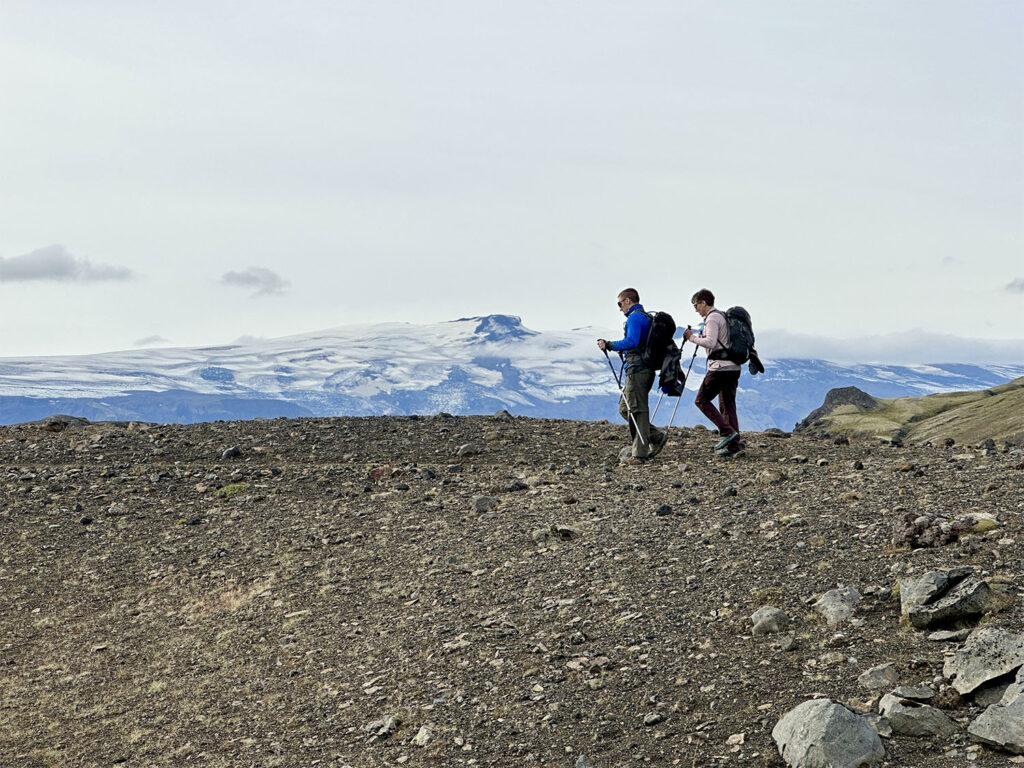As we pressed on, the landscape gradually transformed. The terrain grew greener, and soon we were walking among trees—an exciting sight after days of volcanic desert. Iceland’s only native tree, the white birch, lined our path. We paused atop a bald hill for lunch, taking in expansive views in every direction.
