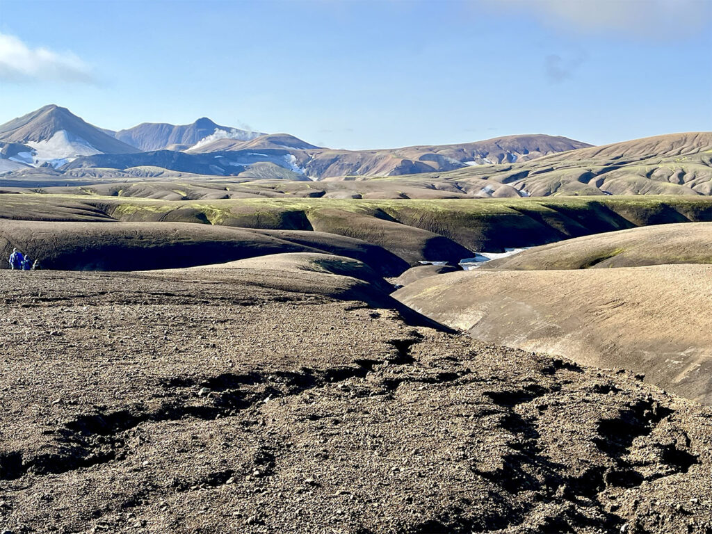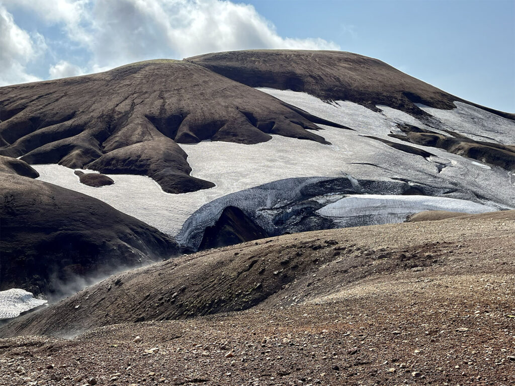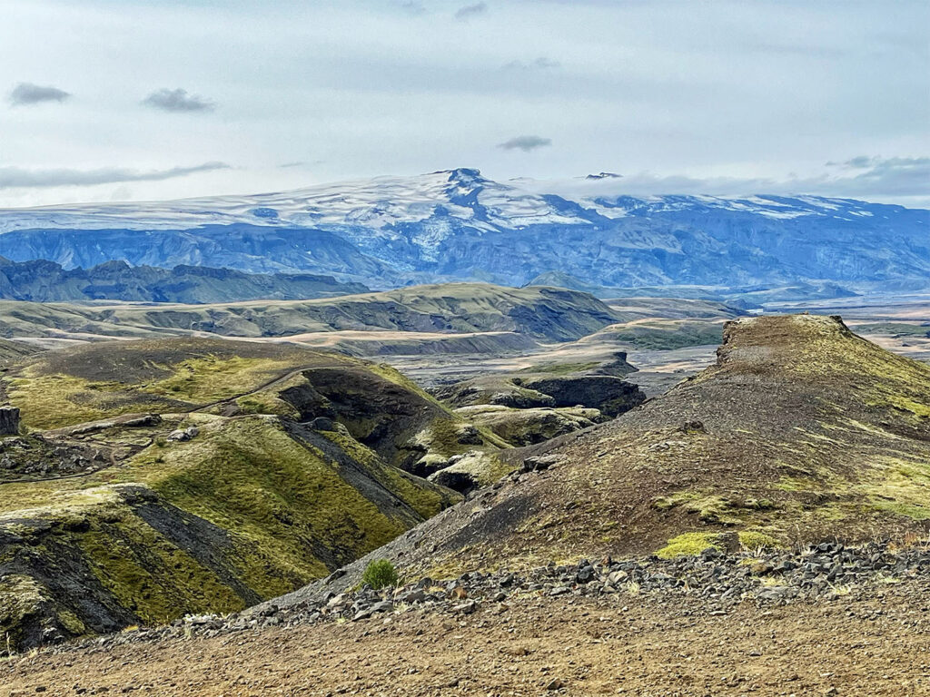 The trail crossed gently rolling basalt hills and passed beneath several delicate snow bridges near Reykjafjöll Mountain. A short but demanding ascent led us up to the Jökultungur plateau, where we paused to admire sweeping views of the route we had already traveled. From this high vantage point, we were also treated to an awe-inspiring panorama of three glaciers: Tindfjallajökull, Eyjafjallajökull, and Mýrdalsjökull. Eyjafjallajökull, of course, being the now-infamous volcano whose 2010 eruption brought European air travel to a halt.