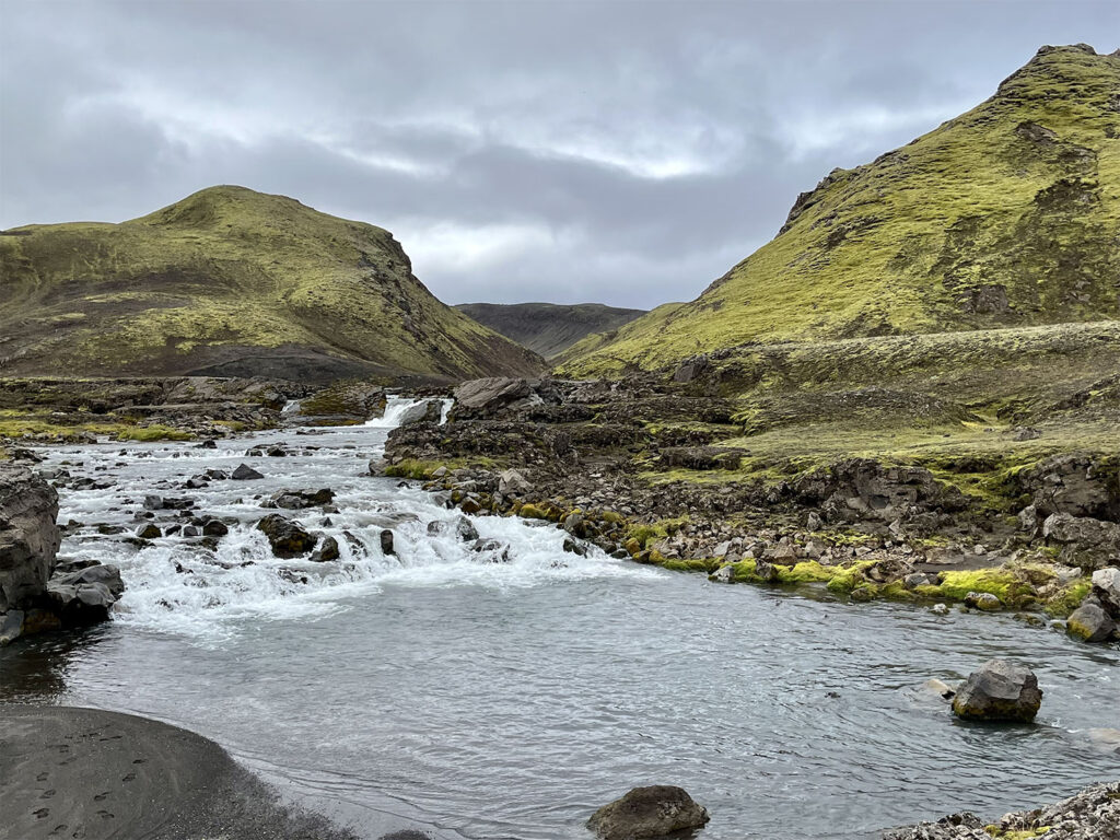 We paused for lunch overlooking the valley, then began the long, steep descent toward the lake. Before reaching the hut, we encountered our first river crossing: the Grashagakvísl River. A cable strung across the current offered extra stability, though the crossing was still brisk and invigorating.
