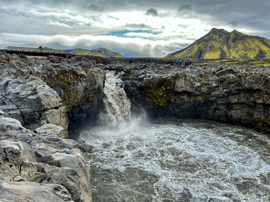 From there, we entered the black sand desert—an expansive, flat stretch of volcanic soil, stark and otherworldly. Our final river crossing of the day was at the Innri-Emstruá River, where a dramatic waterfall tumbles beneath a sturdy bridge used by both hikers and highland vehicles. We stopped here for lunch, enjoying the sound of rushing water and the rugged views before pressing on.