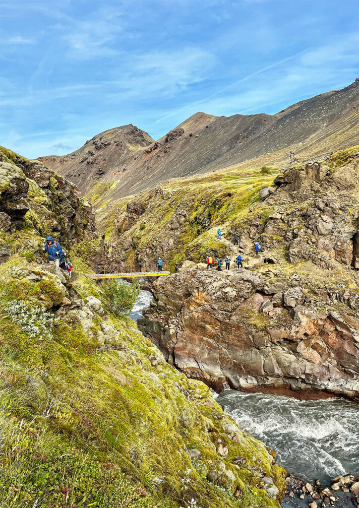 Our route today covered approximately 10 miles (16 km), with our destination being the Botnar Huts in Emstrur. We set off around 9:30 AM, heading east toward the Hvanngil chasm. About 20 minutes into the hike, we encountered our first river crossing of the day: the Bratthálskvísl River. It was considerably wider than the river we’d crossed the previous day, though still relatively shallow and easy to navigate.
