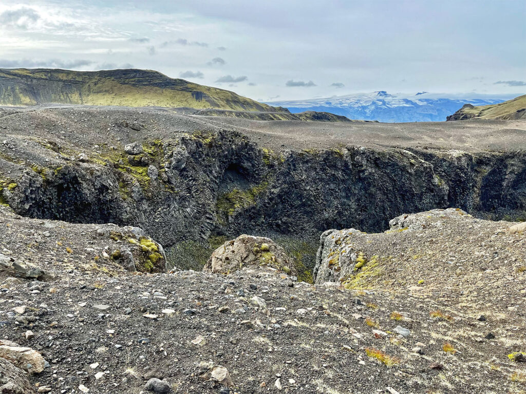 The trail began with a descent toward the Syðri-Emstrua River, which we crossed via a footbridge before climbing once again to a higher plateau. There, we paused at a stunning gorge adorned with gracefully curved basalt columns—a perfect spot for a mid-morning snack. Gazing down into the ravine, we could see two rivers winding through the rock, both fed by meltwater from the Mýrdalsjökull and Eyjafjallajökull glaciers.